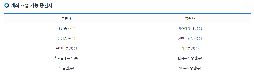 계좌 개설이 가능한 증권사는 대신증권, 미래에셋대우, 삼성증권, 신한금융투자, 유안타증권, 키움증권, 하나금융투자, 한국투자증권, KB증권, NH투자증권 입니다.